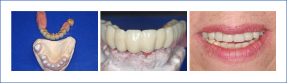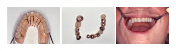 ⇒ Große, festsitzende Metallkeramikbrücken auf eigenen Zähnen und Implantaten.